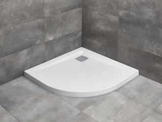 Плоский полукруглый акриловый поддон - радиус r=550мм. Предназначенный для монтажа без ножок - необходимо приклеить на строительный раствор или пену с низким коэффицентом расширения. Отверстие для сифона d=90мм. Рекомендуемый сифон R399 - с квадратной крышкой.