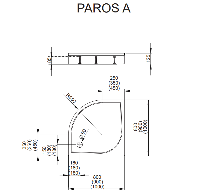Душевой поддон для монтажа непосредственно на пол или с панелью, отверстие под сифон Ø 90 мм, ножки в комплекте, рекомендуемыe сифоны TB 90P, R400 SLIM.